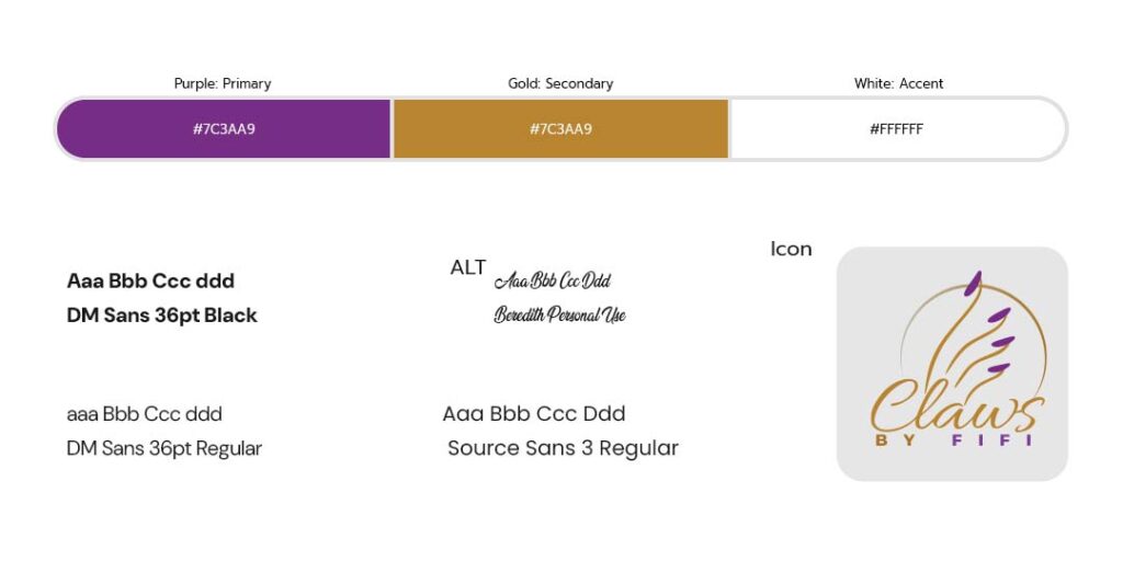 The color palette blends gold and purple, communicating sophistication and creativity perfect for a premium beauty brand. The layout maintains harmony between elegance and readability, ensuring strong brand recognition across print and digital platforms. Together, these elements project a confident, high-end personality that aligns with Claws by Fifi’s mission to make every client feel stylish, pampered, and powerful through exceptional nail artistry — a design that meets LogoCert standards for clarity, meaning, and timelessness.